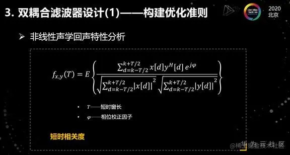 第一步就是构建优化准则。我觉得构建优化准则,应该是整个滤波器设计里面最重要的一步,因为它决定了滤波器性能的上限。什么样的优化准则是一个好的优化准则呢?我觉得好的优化准则需要跟问题的物理特性有效匹配起来,所以在构建优化准则之前,我们先对非线性声学回声的特性进行分析,希望通过这种分析去挖掘非线性声学回声的一些物理特性。