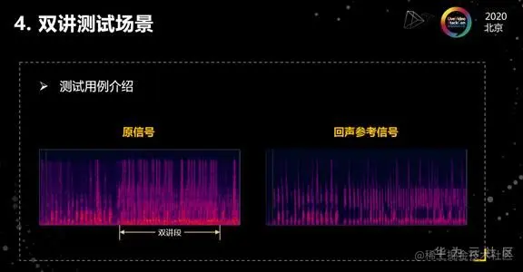 最后再进入双讲测试场景。我首先介绍一下测试的示例,这组数据是一个视频会议的数据,左边这个图是原始的麦克信号语谱图,右边这个图是回声参考信号语谱图,我们比较这两个图之后就会发现,双讲段主要出现在中间这一段。