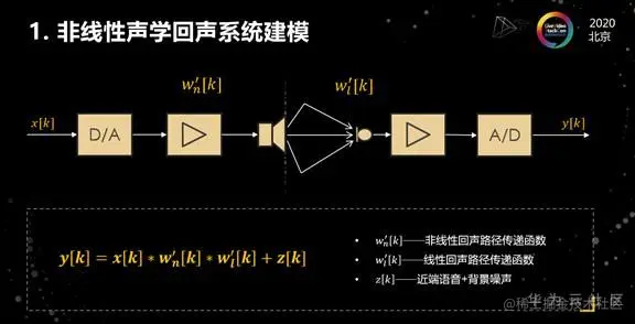 我觉得要解决这个问题,核心就是要认识清楚这里面的每一个环节,看看它们到底是线性系统还是非线性系统,如果所有的环节都是线性的话,那么很自然y[k]就是一个线性的回声,否则只要有一个环节是非线性的,那么这个回声就是非线性回声。