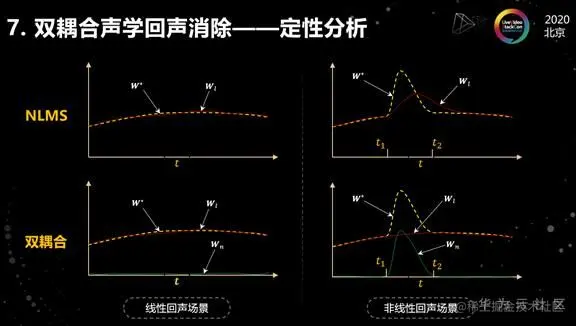 接下来我们再看一下右边的非线性声学回声场景。我们假设非线性的失真主要出现在t1到t2这个时间段内,大家可以看到黄色线在这个时间里,出现了一次突变,对于NLMS算法,当出现非线性失真之后,它的线性滤波器会去逼近非线性失真。但是由于学习的速度跟不上滤波器变化的速度,所以它跟真实的值之间总是存在一个比较大的gap。 同时当非线性失真消失之后,它还需要一段时间恢复到正常状态,因此在整个时间段里,都会出现回声泄露的问题。