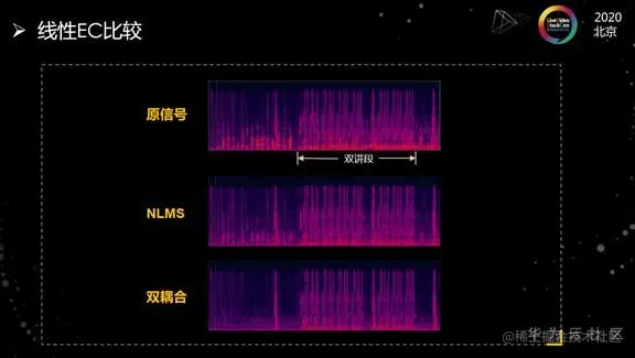 我们评估双讲性能的主要指标是回声抑制比和近端语音失真度。上面这三幅图是经过回声消除之后的语谱图,中间的图是NLMS算法的结果。我们可以看到它的回声抑制不是很理想,不管在单讲段还是在双讲段,都有比较多的回声残留。而最下面这个图是采用双耦合算法得到的语谱图,可以看到在单讲和双讲里面回声抑制得都比较干净,并且在双讲里,对近端语音的损伤也很小。这个数据对应视频会议场景,因此还需要做最后一步NLP的处理。