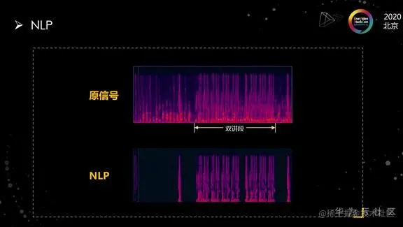 上面这个图就是基于双耦合算法,做了NLP之后的输出结果。我们可以看到处理完之后,整个语谱很清晰,回声去得很干净,而且语谱没有太大损伤,双讲很通透。