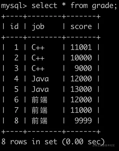 第8行表示用户id为8的用户选择了前端岗位并且考了9999分