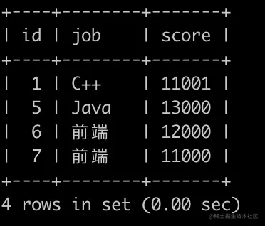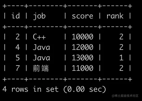 第4行表示前端岗位的中位数位置上的为用户id为7,分数为11000,在前端岗位里面排名是第2
