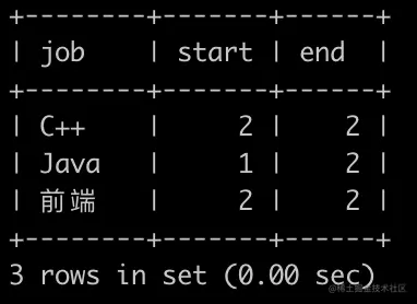 第3行表示前端岗位的中位数位置范围为[2,2],也就是2。因为前端岗位总共3个人,是奇数,所以中位数位置为2是正确的(即位置为2的11000是中位数)