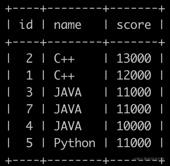 请你找出每个岗位分数排名前2的用户,得到的结果先按照language的name升序排序,再按照积分降序排序,最后按照grade的id升序排序,得到结果如下: