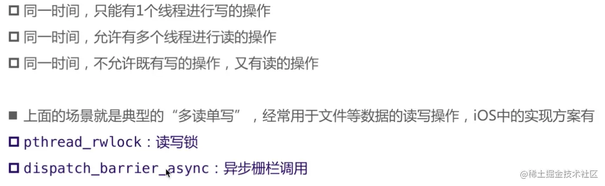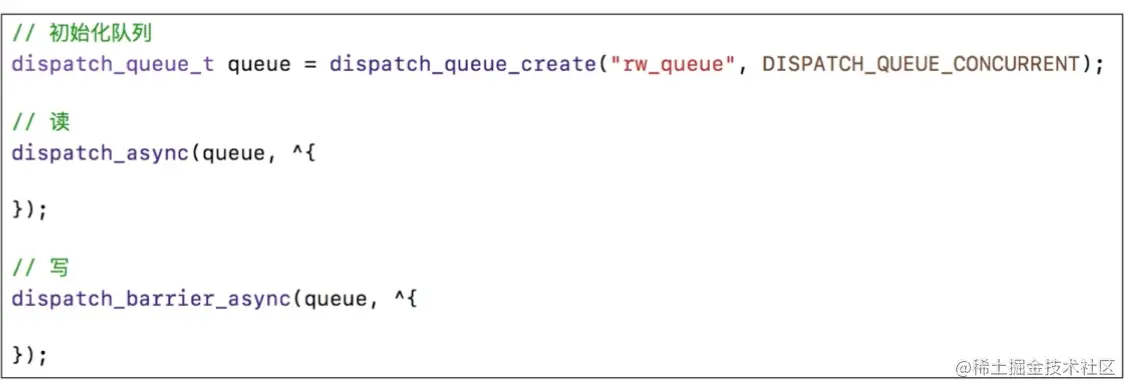 dispatch_barrier_async这个函数传入的并发队列必须是自己通过 creat 创建的并发队列,如果传入的是一个串行或者是一个全局的并发队列,那这个函数等同于 dispatch_async 函数的效果