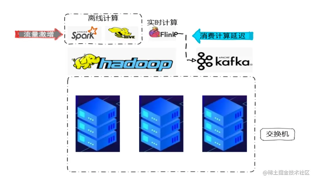 这个问题是最近才出现的问题,也可能不仅仅是同交换机,同机房的情况也可能。在同一个交换机下我们部署了很多机器,一部分机器部署了 Kafka 集群,还有一部分部署了 Hadoop 集群。在 Hadoop 上面我们可能会进行 Spark、Hive 的离线计算以及 Flink 的实时计算,Flink 也会消费 Kafka 进行实时计算。在运行的过程中我们发现某一个任务会出现整体延迟的情况,排查过后没有发现其他的异常,除了交换机在某一个时间点的浏览激增,进一步排查发现是离线计算的浏览激增,又因为同一个交换机的带宽限制,影响到了 Flink 的实时计算。