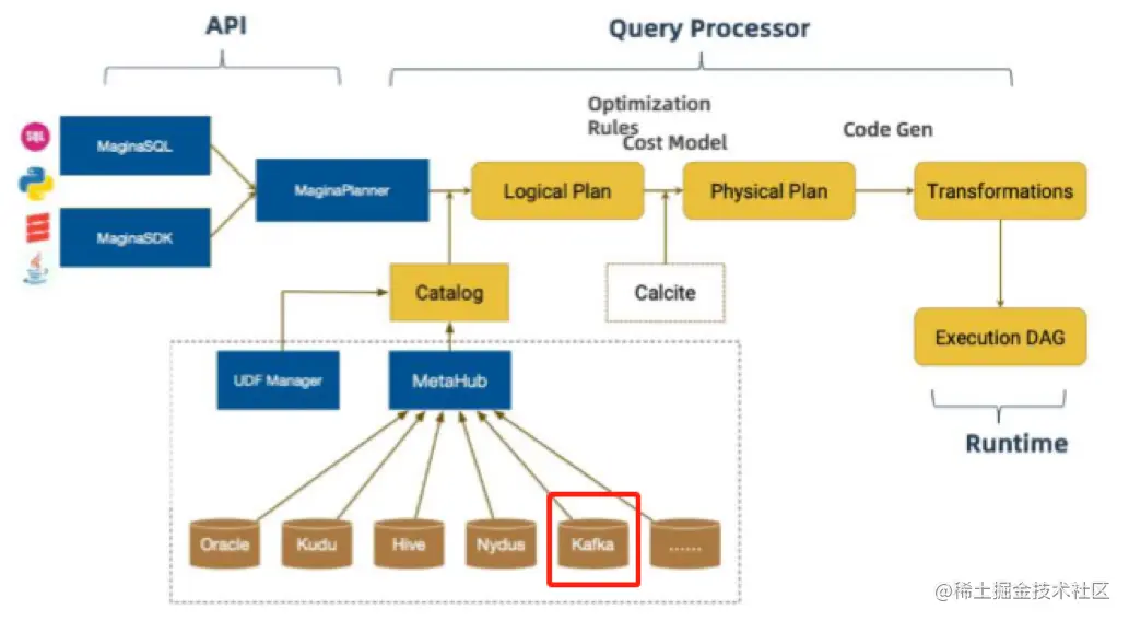 基于 Flink 1.0 版本我们做了一个 Magina 版本的重构,在 API 层次我们提供了 Magina SQL 和 Magina SDK 贯穿 DataStream 和 SQL 操作;然后通过自定义 Magina SQL Parser 会把这些 SQL 转换成 Logical Plan,在将 LogicalPlan 转化为物理执行代码,在这过程中会去通过 catalog 连接元数据管理中心去获取一些元数据的信息。我们在 Kafka 的使用过程中,会将 Kafka 元数据信息登记到元数据中心,对实时数据的访问都是以流表的形式。在 Magina 中我们对 Kafka 的使用主要做了三部分的工作: