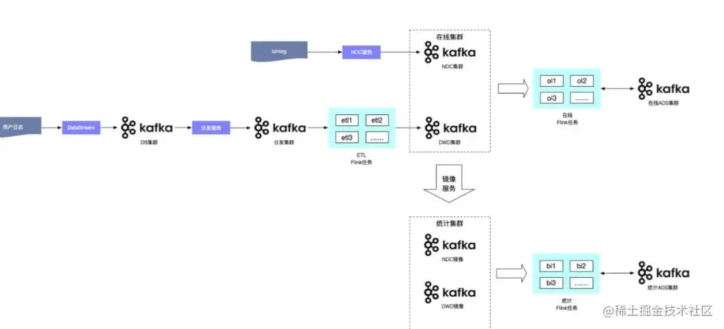 针对以上问题,我们进行了如下图所示的 Kafka 集群隔离和数据分层处理。其过程简单来说,将集群分成 DS 集群、日志采集集群、分发集群,数据通过分发服务分发到 Flink 进行处理,然后通过数据清洗进入到 DW 集群,同时在 DW 写的过程中会同步到镜像集群,在这个过程中也会利用 Flink 进行实时计算的统计和拼接,并将生成的 ADS 数据写入在线 ADS 集群和统计 ADS 集群。通过上面的过程,确保了对实时计算要求比较高的任务不会受到统计报表的影响。