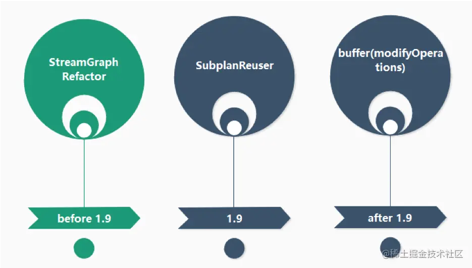 于是我们想,是否可以避免临时中间结果的多次消费。在 1.9 版本之前,我们进行了 StreamGraph 的重建,将三个 DataSource 的 DAG 进行了合并;在 1.9 版本,Magina 自己也提供了一个查询和 Source 合并的优化;但是我们发现如果是在同一个 data update 中有对同一个表的多个 Source 的引用,它自己会合并,但是如果不是在同一个 data update 中,是不会立即合并的,于是在 1.9 版本之后中我们对 modifyOperations 做了一个 buffer 来解决这个问题。