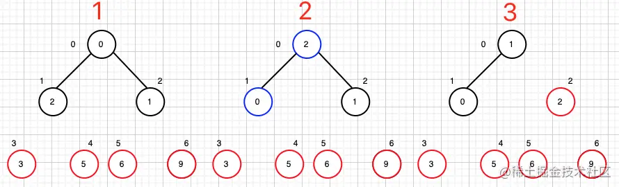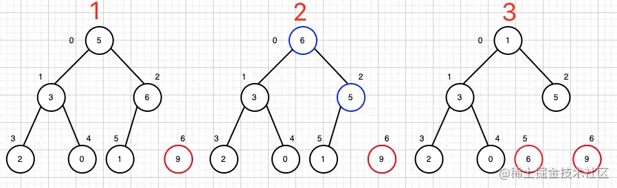 - 将每个父节点跟左右子节点作比较,将大/小的子节点和父节点做交换,直到将堆变成最小堆或者最大堆