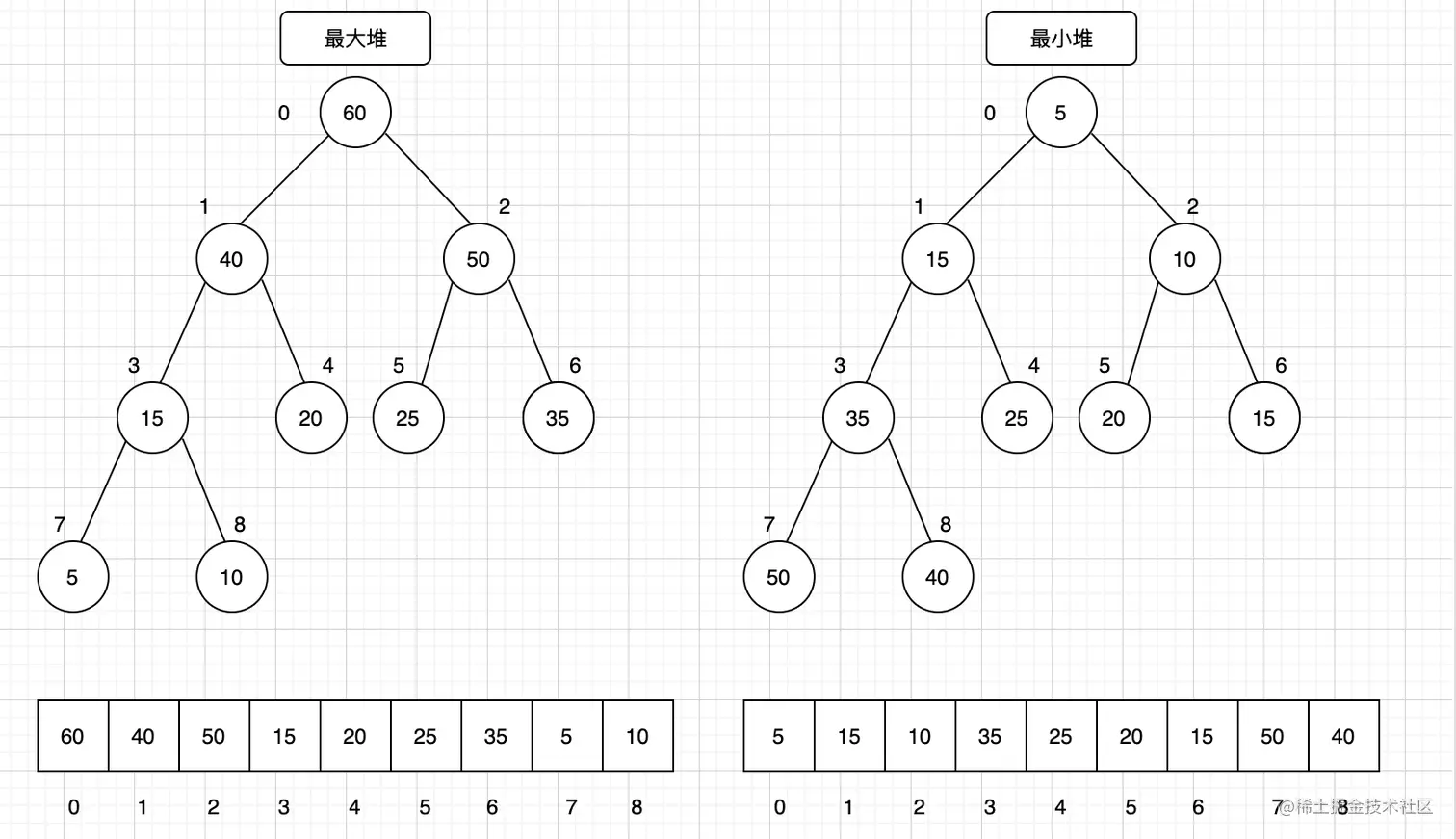 堆是一种特殊的完全二叉树,它的性质为:任意节点大于等于或者小于等于它的左右节点。如果任意节点大于等于它的左右节点,此堆称为最大堆;反之,任意节点小于等于它的左右节点,此堆称为最小堆。