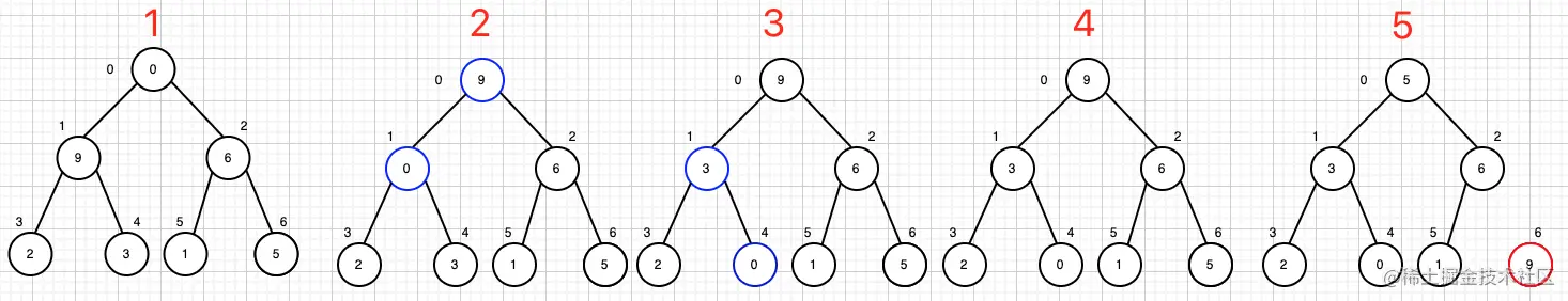 接下来的操作就是重复上述的流程,直到堆顶为止,看下图的流程: