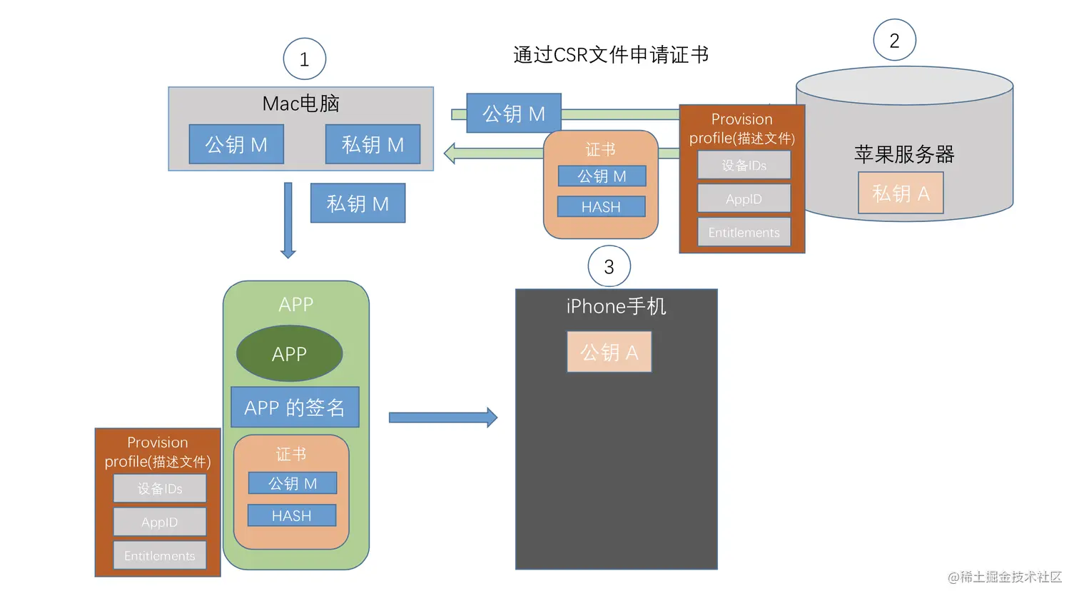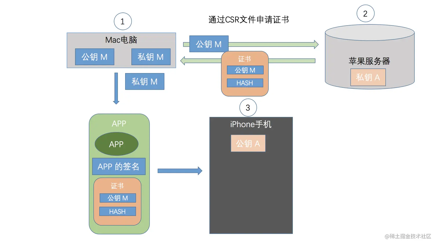 4)在开发时,编译完一个App后,用本地的私钥M对这个App进行签名,同时把第三步得到的证书一起打包进App里,安装到手机。