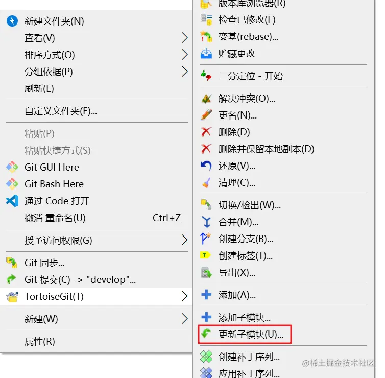 在TortoiseGit中入下图,在想要更新子模块的位置进行更新。