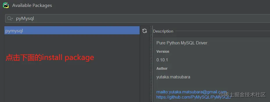 ①常规操作:Pycharm ->File点击setting ->Project文件下 ->点击Project Interpreter ->点击右边+号,找到pymysql,安装install package。