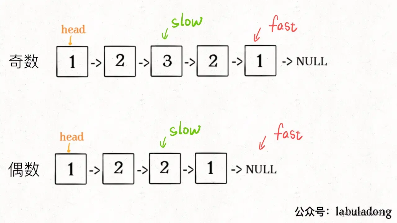 具体到回文链表的判断问题,由于回文的特殊性,可以不完全反转链表,而是仅仅反转部分链表,将空间复杂度降到 O(1)。