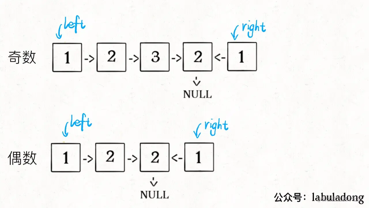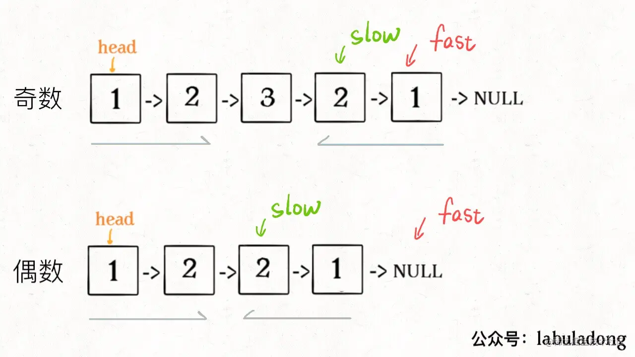 首先,寻找回文串是从中间向两端扩展,判断回文串是从两端向中间收缩。对于单链表,无法直接倒序遍历,可以造一条新的反转链表,可以利用链表的后序遍历,也可以用栈结构倒序处理单链表。