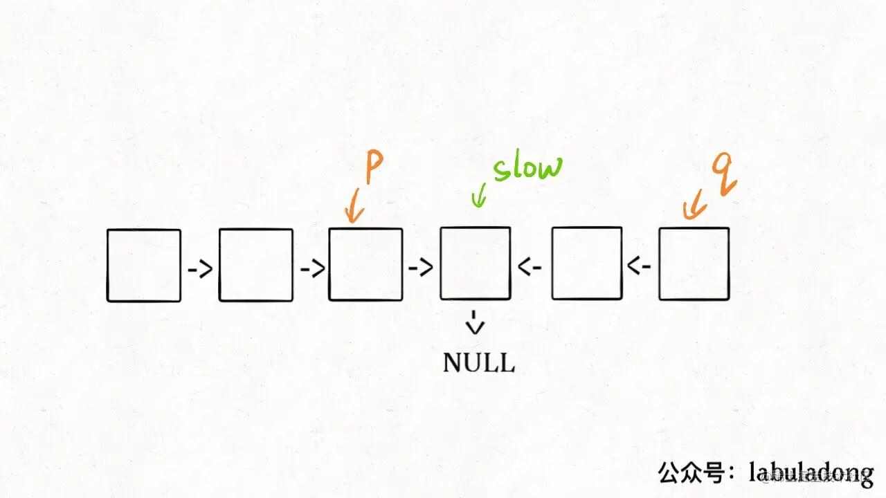 3、从slow开始反转后面的链表,现在就可以开始比较回文串了: