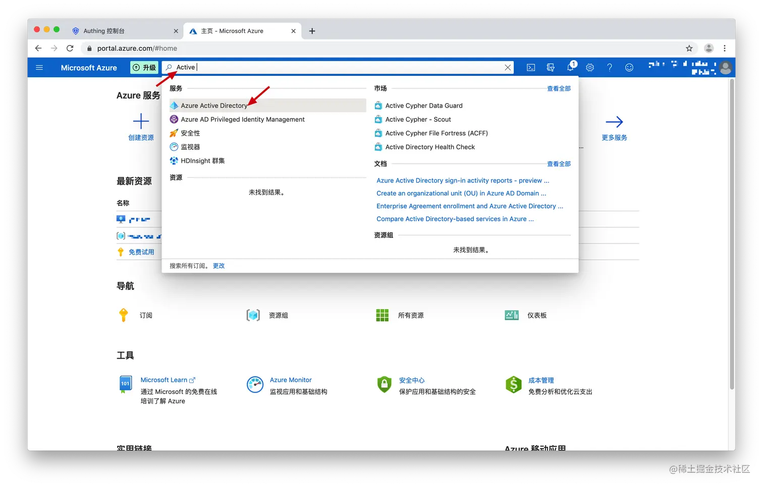 登录 Azure,在搜索框搜索 Active Directory,选择「Azure Active Directory」,如下图所示: