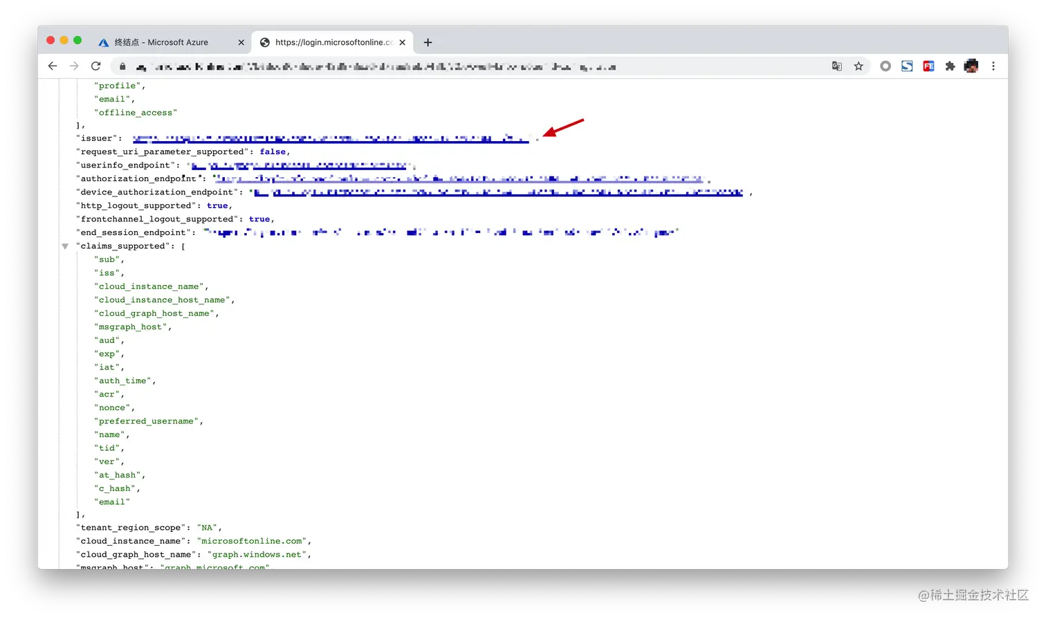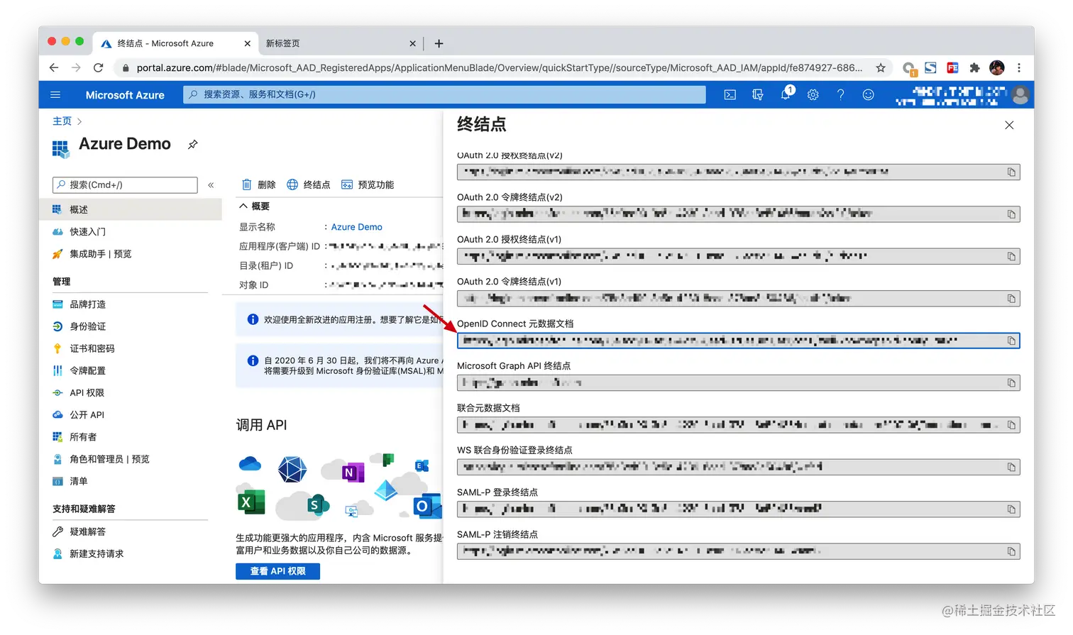 回到应用概述页面,点击「终节点」Tab,找到「OpenID Connect 元数据文档」,在浏览器打开链接。