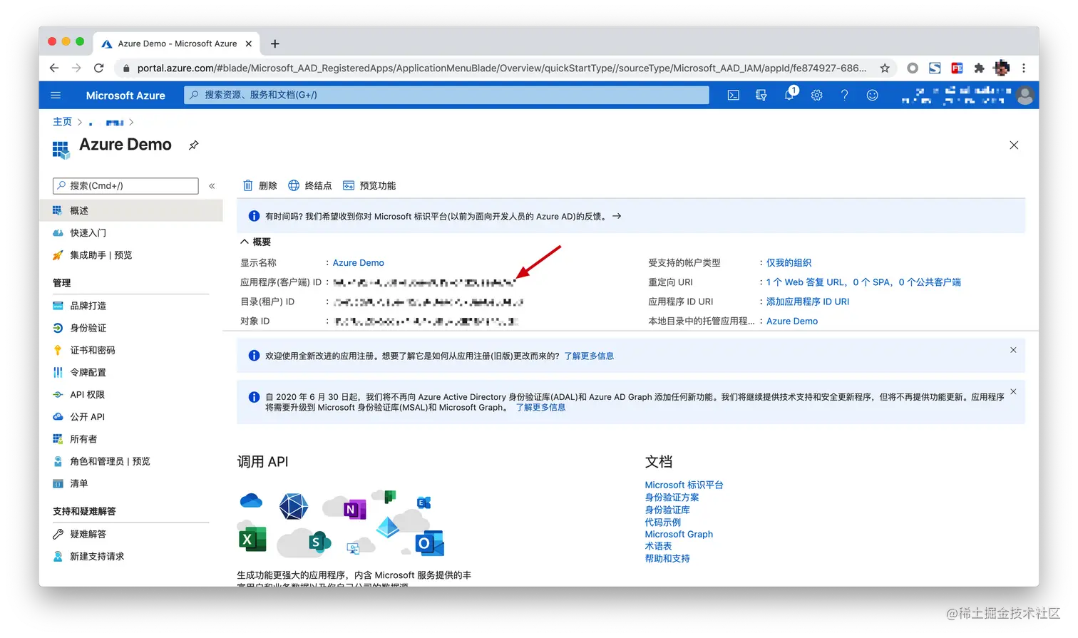 找到你的应用,进入应用概述页面,记录应用程序 ID。