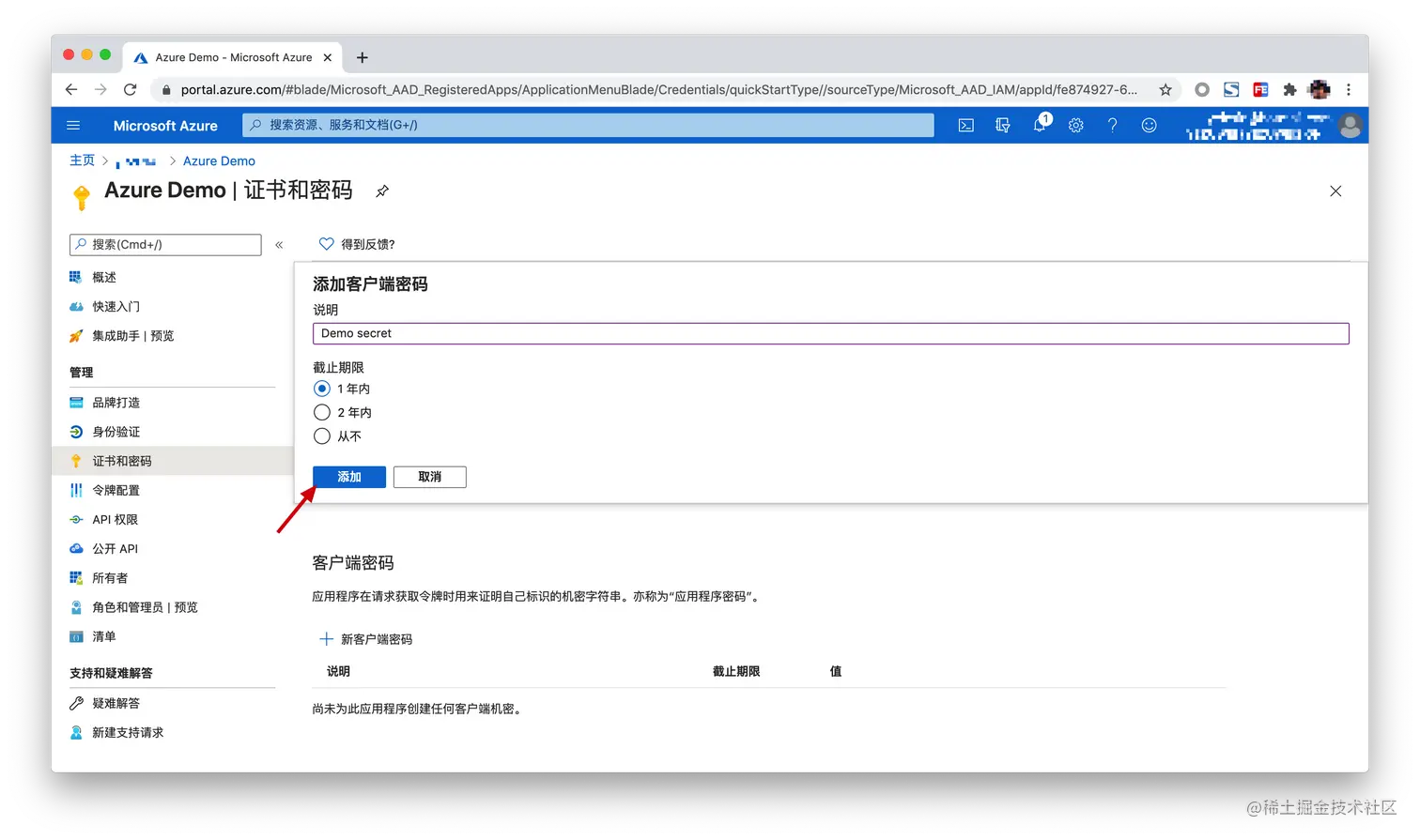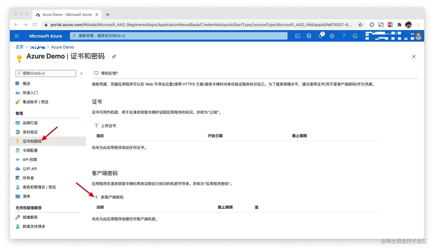 在左侧菜单,点击「证书和密码」,然后点击「新客户端密码」。