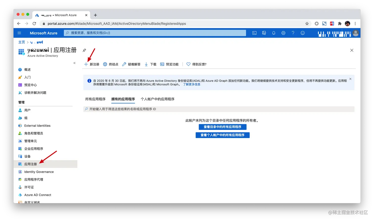 在左侧菜单点击「应用注册」,点击「新注册」。