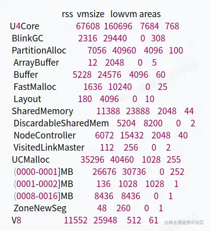 上图是我们输出的 U4 渲染引擎在某个时刻内存占用情况。我们可以看到,在 U4Core 分组下,总共有 BlinkGC、PartitionAlloc、SharedMemory、UCMalloc、V8几个分类,这其实就是渲染引擎内部分配和管理内存的几大模块。
