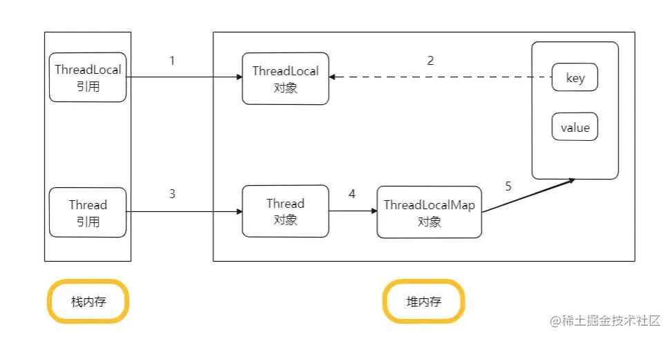 当 ThreadLocal 使用结束,栈内存的 ThreadLocal 引用被回收,即引用 1 不再指向 ThreadLocal 对象。