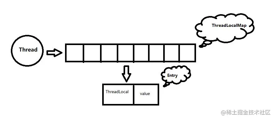 如上图,由 Thread 实例内部维护名为 ThreadLocalMap 的容器,其元素是以 ThreadLocal 实例为 key ,保存对象作为 value 的数据结构,与我们猜测的实现方式相反。