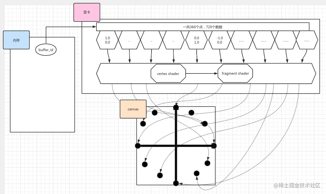 gl.drawArrays : 绘制。具体就是,让显卡将 buffer 中的每一个 坐标点 全部经过当前 program运算之后,得到 最终坐标和最终颜色。然后绘制到 canvas 上。