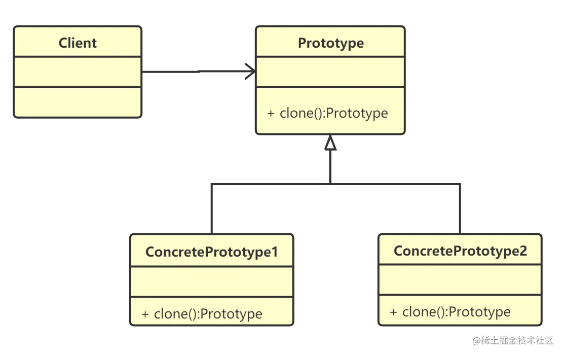 - 抽象原型类(Prototype):规定了具体原型对象必须实现的接口