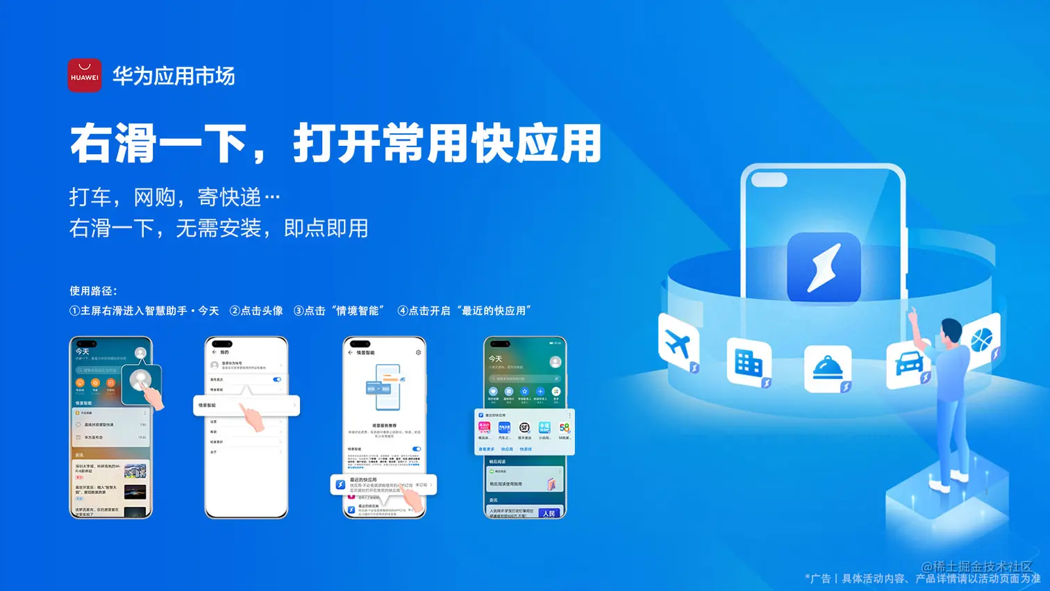 携程本身具有较好的用户口碑,而华为快应用有丰富的入口与强大的流量扶持。华为快应用不同于原生应用,无需下载安装,可直接从华为应用市场、快应用中心、智慧助手·今天、全局搜索等渠道直接打开,对于首次以及较低频次使用携程旅行快应用的用户来讲节省了手机空间、打开时间,十分友好。
