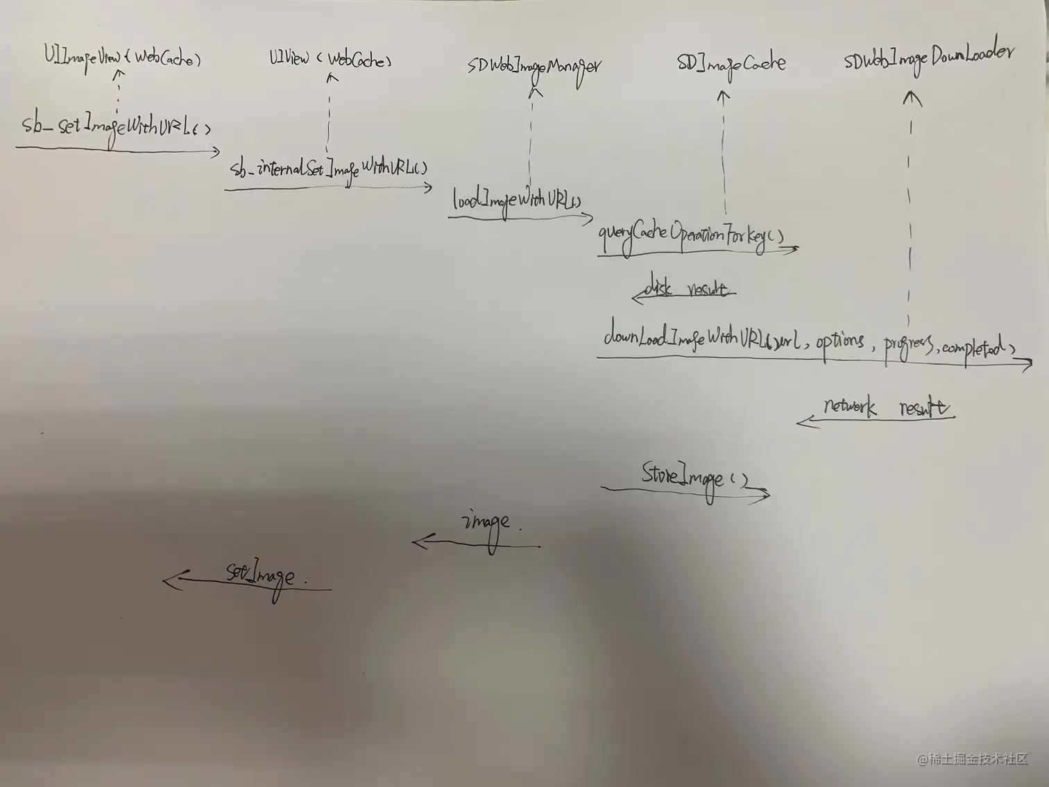 sd_setImageWithURL中的调用流程,我建议大家谨记于心,可以手动画一画流程图,帮助记忆。当然不是说这里非要硬背这个流程,因为这个核心的流程也是SDWebImage的核心工作原理。下面是一幅我自己手画的流程图,忽略我这个丑丑的字,希望你也可以动手画一画。
