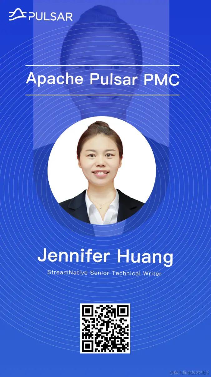继十月份 Apache Pulsar 社区迎来两位新 Committer 后,在十一月初,社区又迎来首位女性 PMC 成员。在经历了 PMC 们的推荐与投票后,来自 StreamNative 团队的 Jennifer (GitHub 地址:@Jennifer88huang)加入了 PMC 的团队。Jennifer 撰写了大量 Pulsar 技术文档,并积极推动 Pulsar 的社区建设。