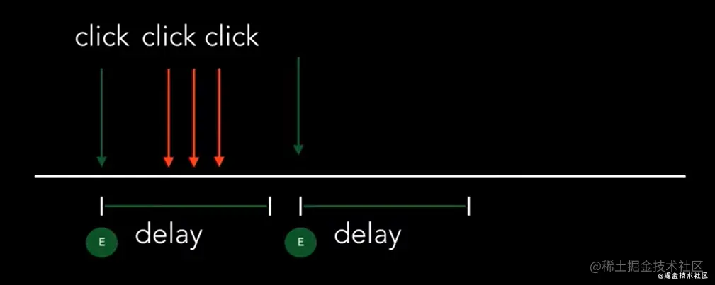 - 防抖:Debounce连续快速触发事件时,只有在间隔时间大于delay时才执行。