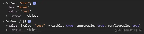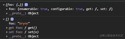 这两种方法构造出的对象作为另一个对象的原型,都会使得另一个对象在控制台输出时有对应的属性,但它并不是真正的属性(getOwnDescriptors没有)