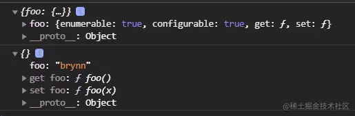 - get:获取属性时调用的函数(使用console.log(Brynn.name)就会调用get函数)