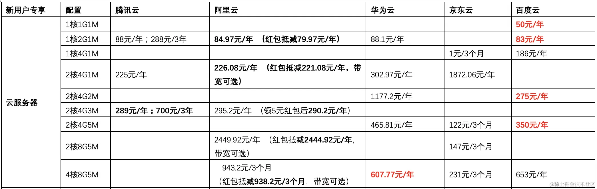 云厂商双十一促销,云服务器你pick哪家? william007 2020-11-11 153 阅读1分钟 又到双十一,不仅是各家电商的主场show,也是各加云厂商的必争之地,那双十一期间有哪些云产品值得新人入手呢~~~ 敲黑板—云服务器篇新手福利 对比阿里云、华为云、腾讯云、百度云及京东云,百度云云服务器价格绝对优势胜出。 从使用场景上来说,如果是建站等轻量应用推荐购买共享型1核1G/1核2G/2核4G/4核8G,如果是初创团队及中小企业推荐选择计算型2核4G/4核8G 个人对比了各家的云服务器价格(仅供参考)