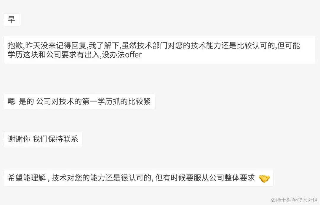 第二天就得到回复:技术过关,学历不达标,不能发OFFER。