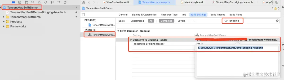 4、进入项目配置, 选择TARGETS-TencentMapSwiftDemo, 然后进入到Build Setting中. 在搜索栏中搜索Bridging, 并在Objective-C Bridging Header选项中输入: $(SRCROOT)/TencentMapSwiftDemo-Bridging-header.h($(SRCROOT)为快捷指令, 可以直接识别项目的根路径):
