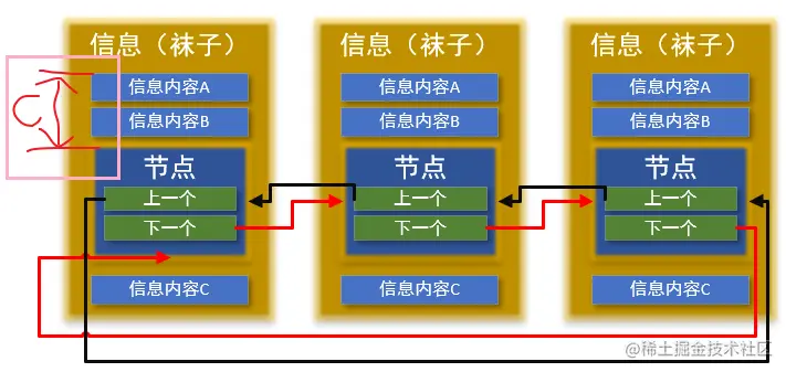 - 袜子:摆到晾衣架圆形框的一截上,使得节点成为袜子的一个成员指针变量