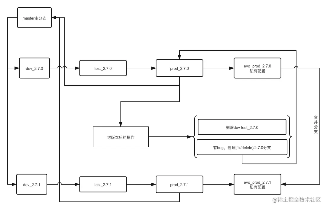 答:如果该分支问题,属于公版(所有版本都有的)存在的问题,就按照上面第六步(6.正式环境出现bug和需求调整?)的流程去走,然后合并到客户分支evo_prod_2.7.3。如果属于客户私有定制的问题,就直接在evo_prod_2.7.3这个分支上面修改,这个修复的私有部分只允许该分支存在。不允许反向合并到其他分支