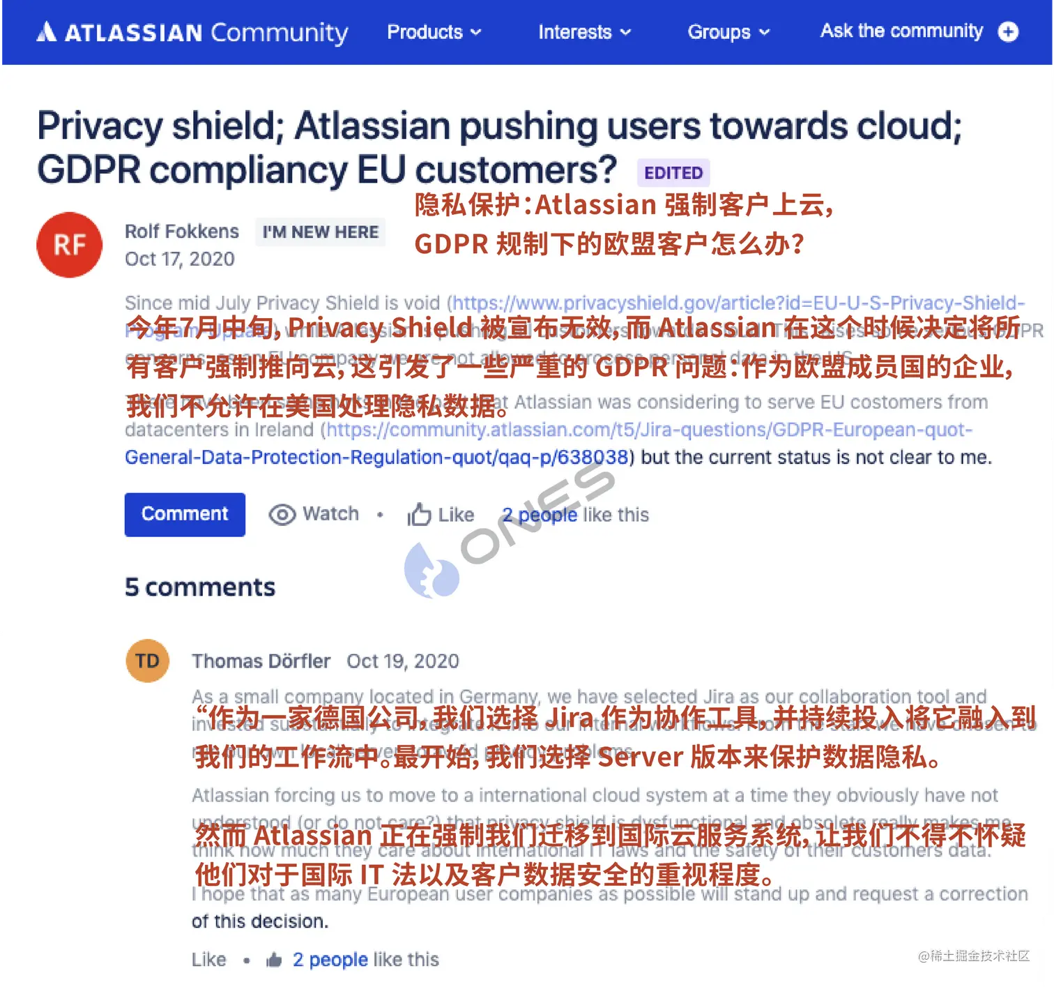 Atlassian 此前承诺,将通过维护「Privacy Shield 认证」来支持适当的国际数据传输机制。然而2020年7月16日,欧盟法院宣布,「EU-U.S Privacy Shield」的保护充分性为「无效」。Privacy Shield 失效,Atlassian 却在此时将所有客户推向了 Cloud,企业数据安全性问题严重:
