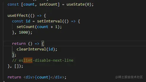 类似于这样的问题是很难被想到的,所以需要启用 eslint-plugin-react-hooks 中的 exhaustive-deps 规则,此规则会在添加错误依赖时发出警告并给出修复建议。
