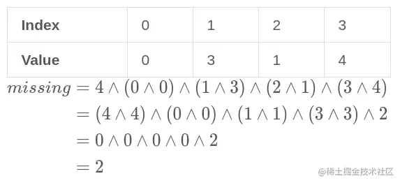 而这道题索就可以通过这些性质巧妙算出缺失的那个元素。比如说 nums = [0,3,1,4]: