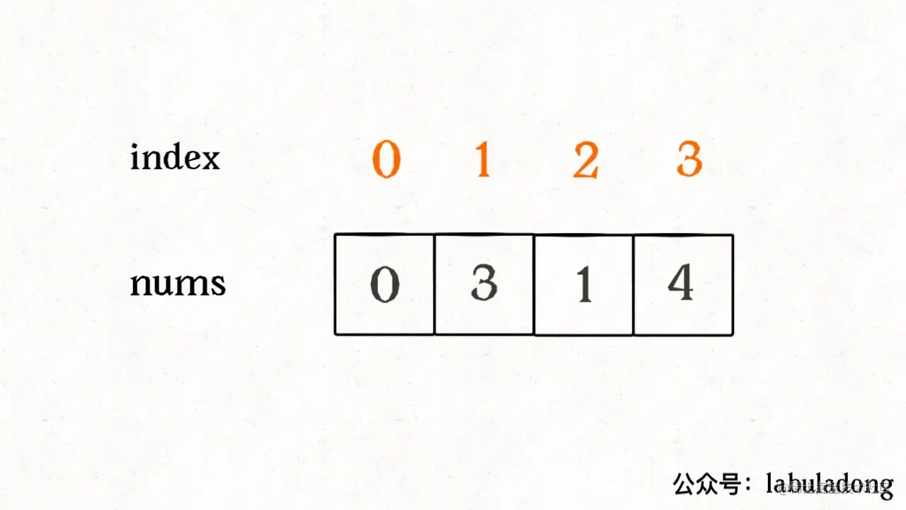 刚才我们的思路是把两个和都加出来然后相减,为了避免溢出,干脆一边求和一边减算了。很类似刚才位运算解法的思路,仍然假设 nums = [0,3,1,4],先补一位索引再让元素跟索引配对: