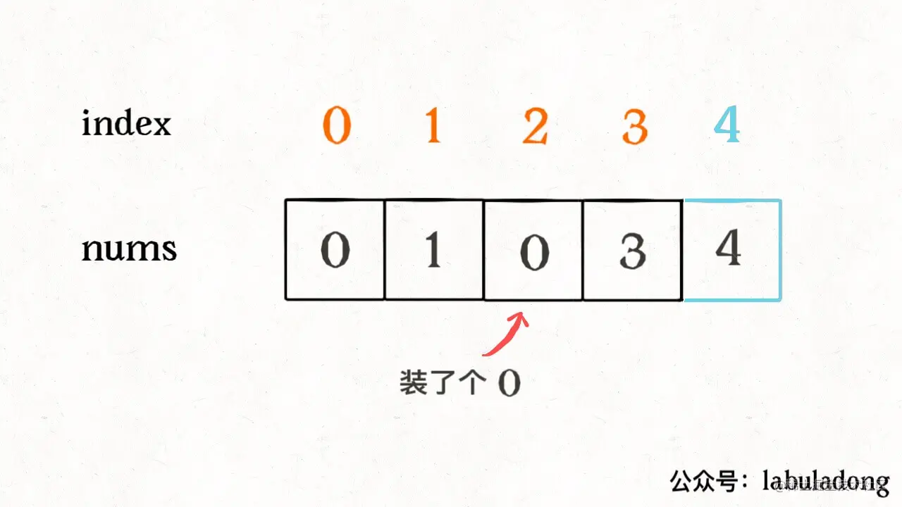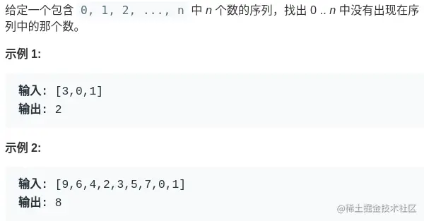 或者说,借助数据结构的特性,用一个 HashSet 把数组里出现的数字都储存下来,再遍历 [0,n] 之间的数字,去 HashSet 中查询,也可以很容易查出那个缺失的元素。